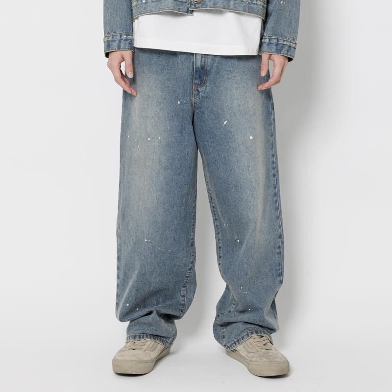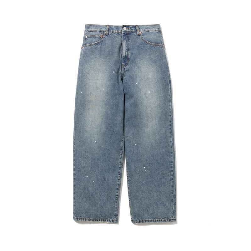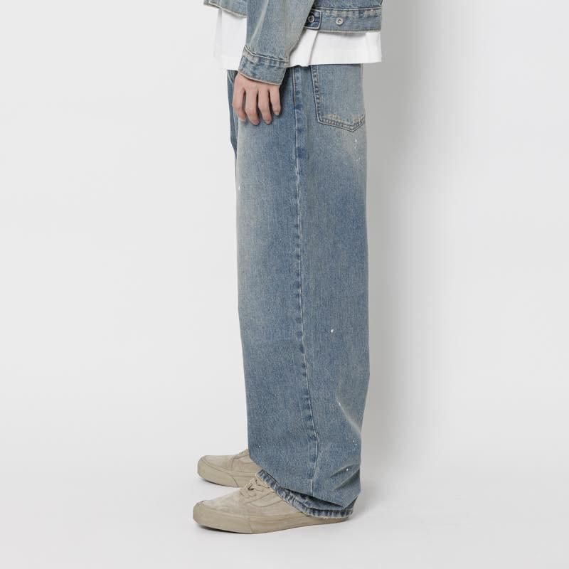 ワイドストレートの5ポケットデニムパンツになります。50年代のヴィンテージデニムをサンプリング。細かい縦スラブの入った13ozデニム生地を採用。ブリーチとオーバーダイ加工を施し、着古した風合いを再現。ハンドメイドのペンキ加工。