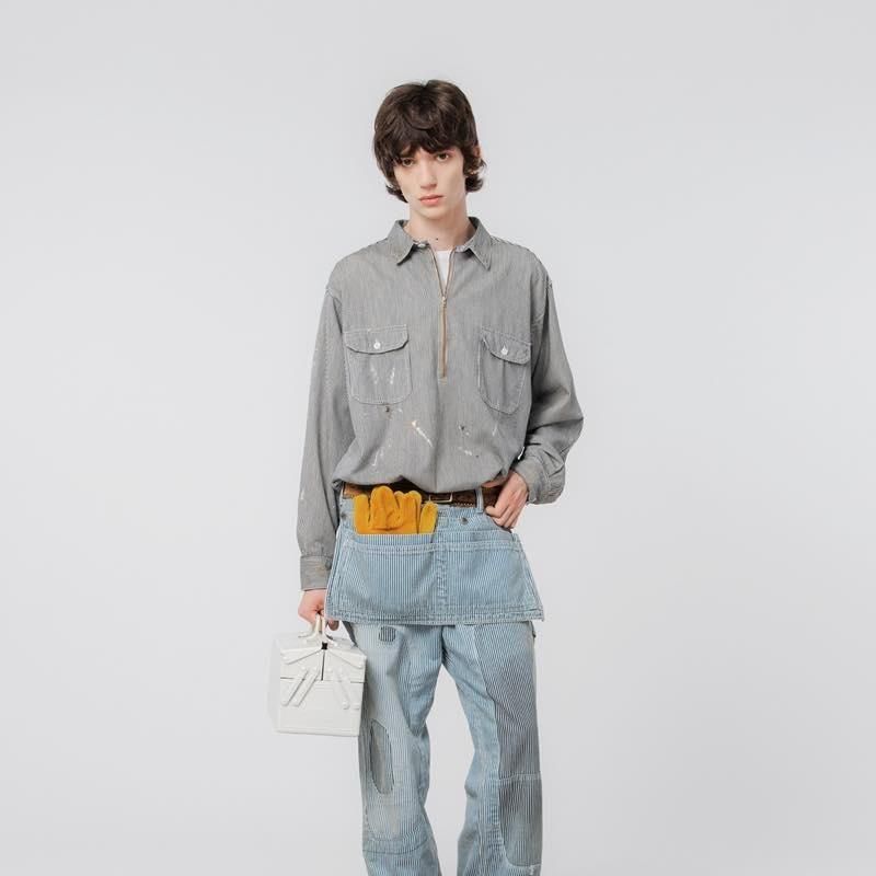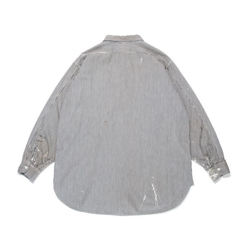 汚れが目立ちにくく、職人たちを支えてきたヒッコリーストライプのワークウェア。 そのヒッコリー生地を用い、1960年代頃まで愛されたプルオーバージップシャツを製作。ゆとりのあるサイズ感に加え、ヴィンテージのディテールを随所に再現。本格的なリアルな汚れ加工を施し、まるで当時の一着のような風合いを表現しました。