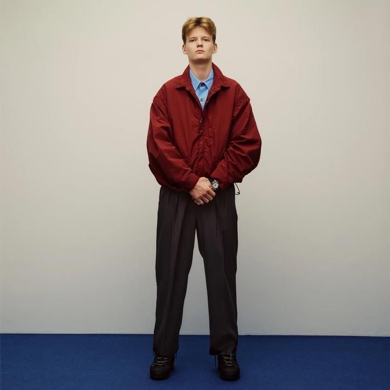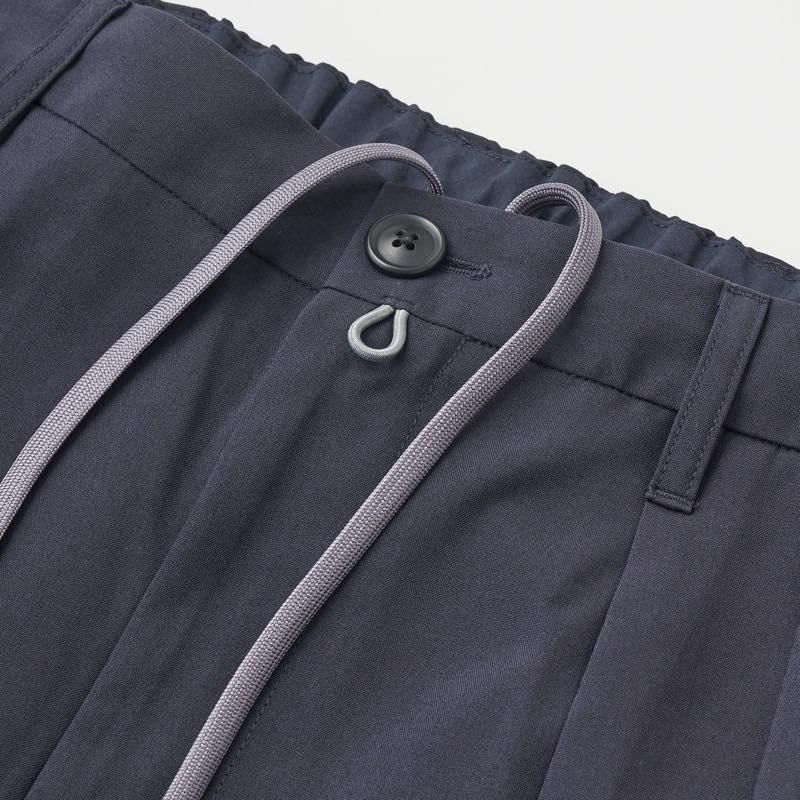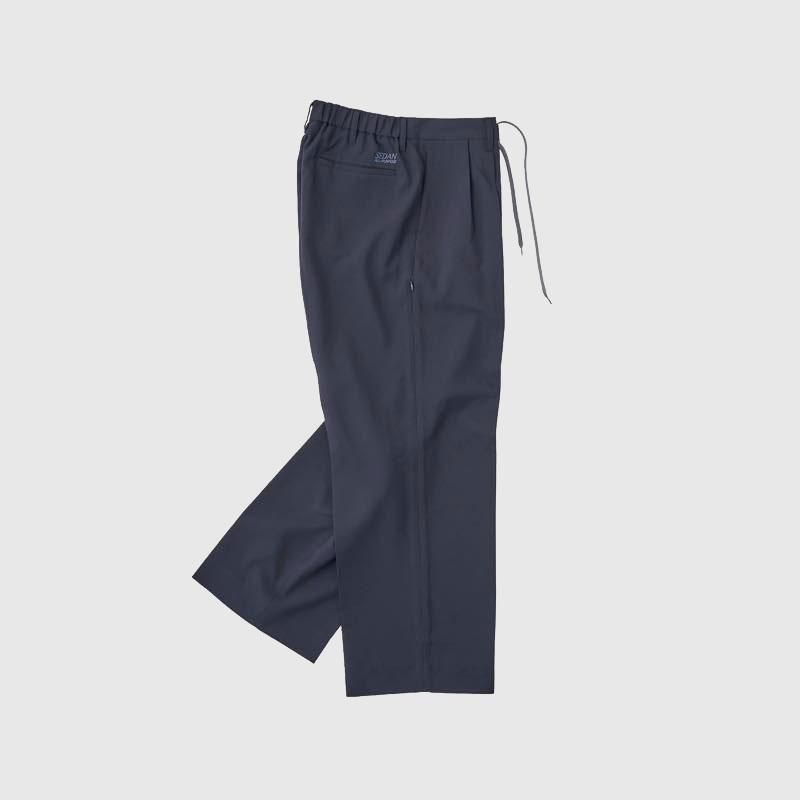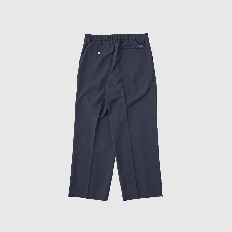 トロピカルウールのようなポリエステル生地で作ったワイドスラックスです。夏でもなんとかしてスラックスを履きたい自分がいるので脇にベンチレーションをつけました。ぜひファスナー全開にしてスースーしていただければ幸いです。汗をかいても洗えるしウエストにはゴムと紐も付くのでベルトレス派の方も大丈夫。とにかく機能的なスラックスなのでぜひお試しください。