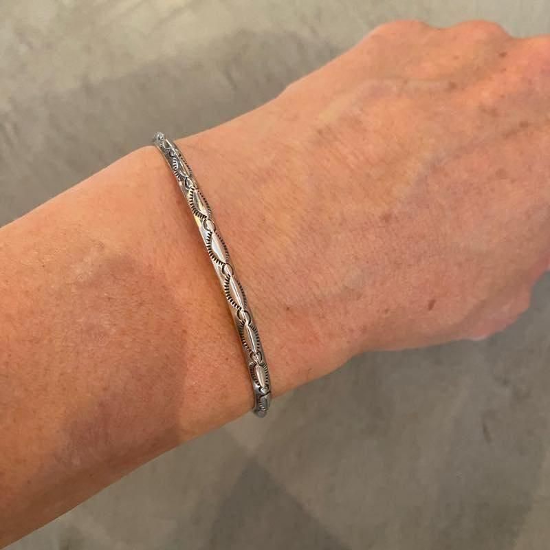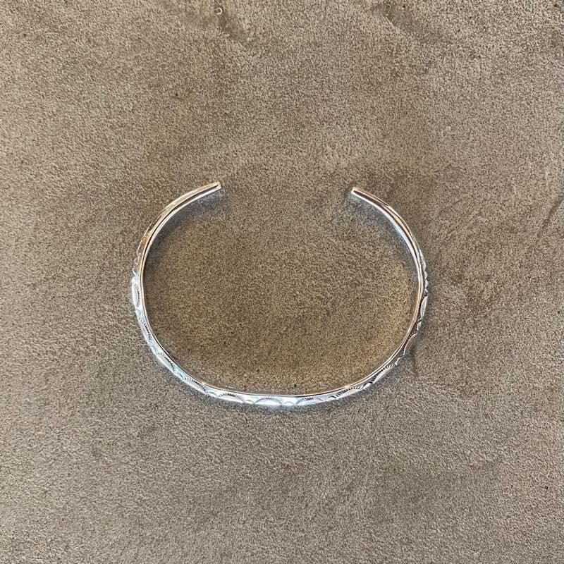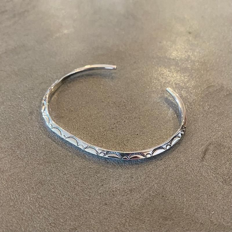 一番細いタイプのバングルになります。トラディッショナルなスタンプワークが施されており一本でも重ね付けでも楽しめるアイテムです。シンプルですが経年変化に伴って独特な表情を楽しめます。