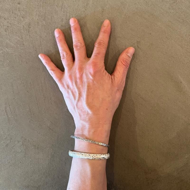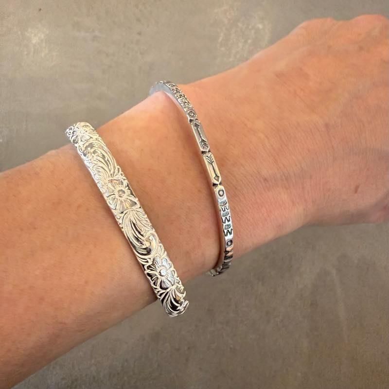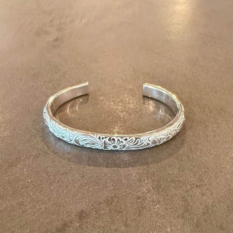 唐草モチーフのバングルになります。トラディッショナルなスタンプワークが施されており一本でも重ね付けでも楽しめるアイテムです。シンプルですが経年変化に伴って独特な表情を楽しめます。