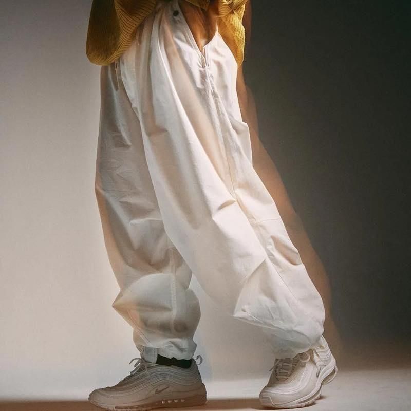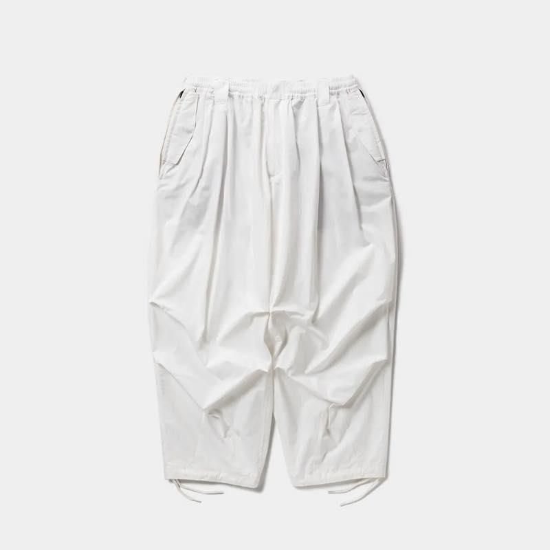 軍物のスノーカモパンツをサンプリングしたバルーンパンツ。高密度に打ち込んだハリ感のあるコットンウェザー生地を使用。膝はダブルタック仕様で、より立体感とゆとりを加えたシルエットです。両脇にはフラップ付きのスラッシュポケットを搭載し、サイドシームに沿った便利なコンシールドファスナーポケットも配置。ウエストはベルトループ付きで内出しのスピンドル仕様。 バックポケットもフラップ付き仕様で、左腰部分にはロゴ入りヌバック風パッチ、右側バックポケットにはオレンジのピスネーム付き。ウエストと裾の内側にはそれぞれ丸紐のスピンドルコード入りで、フィット感とシルエットのアジャストが可能。