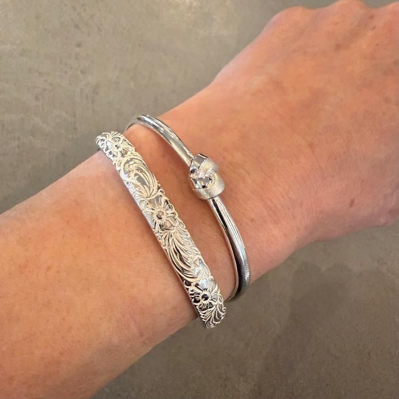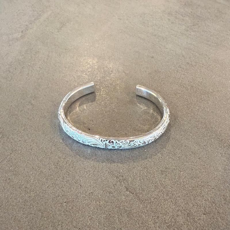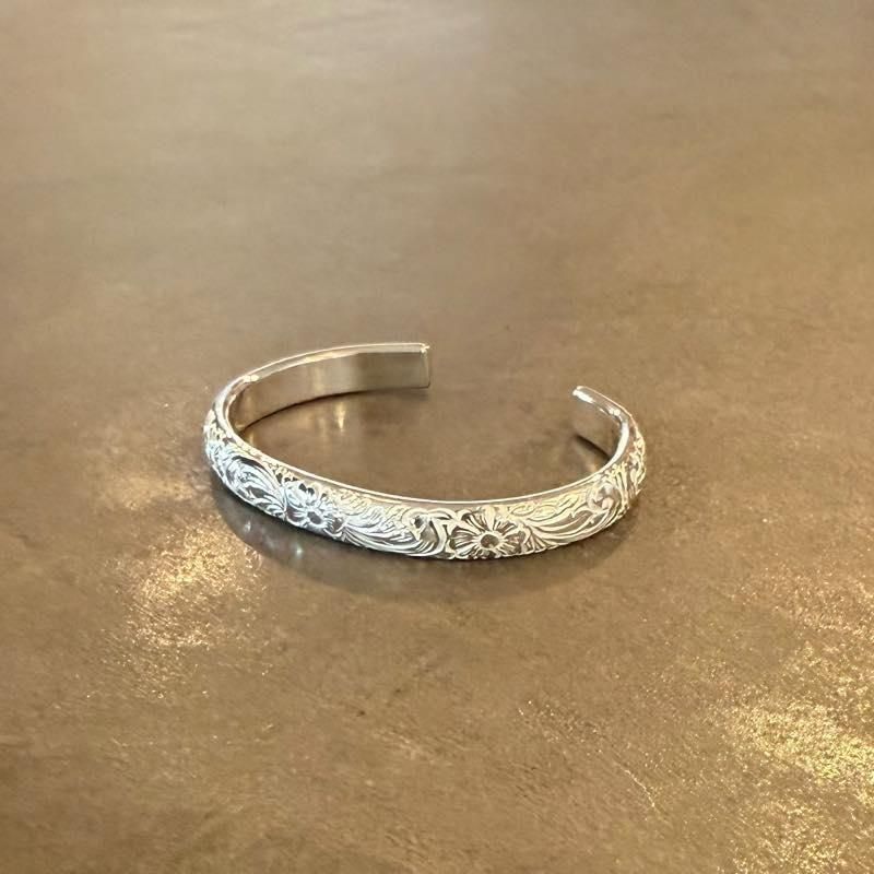唐草モチーフのバングルになります。トラディッショナルなスタンプワークが施されており一本でも重ね付けでも楽しめるアイテムです。シンプルですが経年変化に伴って独特な表情を楽しめます。