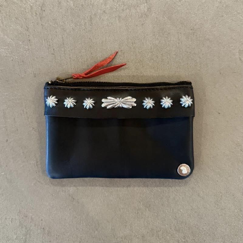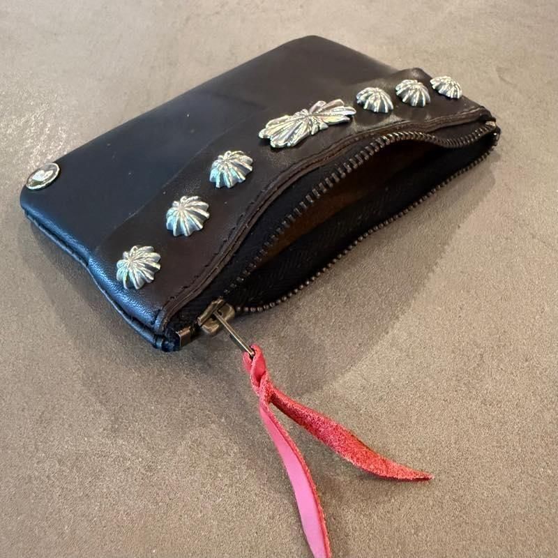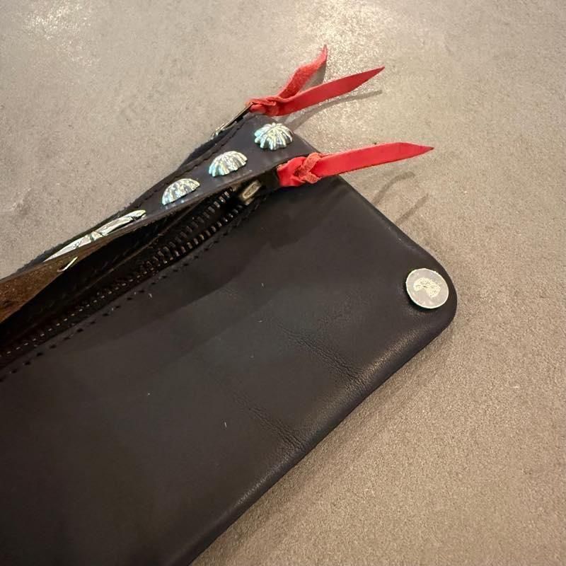 LARRY SMITH(ラリースミス)のZIP WALLETになります。BUTTERFLY & SHELL CONCHA STUDSのカスタムがされています。通称ローレンスレザーと呼ばれるLARRY SMITHオリジナルのオイルをたっぷり含んだレザーを使用して製作されたジップウォレットになります。こちらのジップウォレットに使われるレザーには洗い加工を施し、洗う事で生まれる独特のシワ感が絶妙な雰囲気を演出してくれています。 ジッパーが2箇所付いており、カード、小銭入れなどのマルチウォレットとして活用してもOKです。