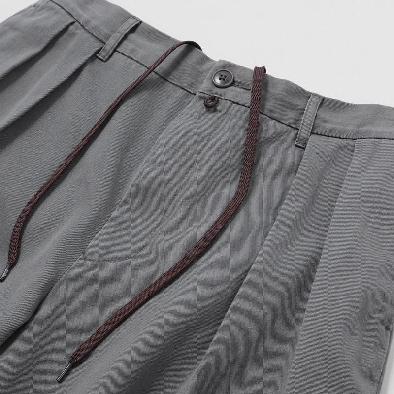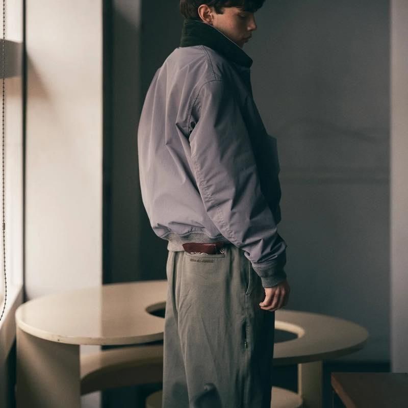 昔から大好きでよく履いているコットンツイルのスラックス。履き込んだ雰囲気が出したかったので特殊な洗い加工を入れてもらいました。シルエットは2タック入りでややテーパードした一番履きやすいシルエット。ウエストの後ろ半分はゴムを入れて、紐もつくのでベルトレスでも履ける。ピンループ(ベルトを固定するためのループ)と紐で少し遊び心を加えつつ、脇のシーム部分にはファスナーで開閉できるメッシュのベンチレーション付き。かしこまったスラックスをちょっとだけカジュアルにしてくれる仕様です。なんとなく革靴よりもスニーカーやサンダルに合わせていただきたいスラックスですが、場面といろんな季節で使えると思います。ヒップポケット口にはロゴ刺繍入り。