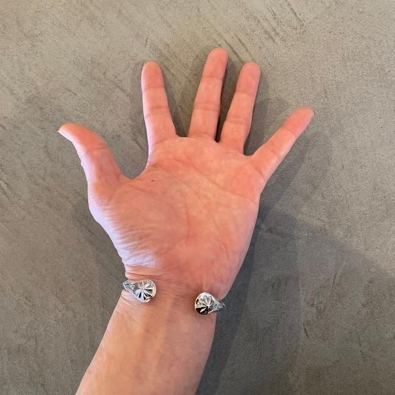 両サイドがシェルのトライアングルタイプのバングルになります。トラディッショナルなスタンプワークが施されており一本でも重ね付けでも楽しめるアイテムです。シンプルですが経年変化に伴って独特な表情を楽しめます。