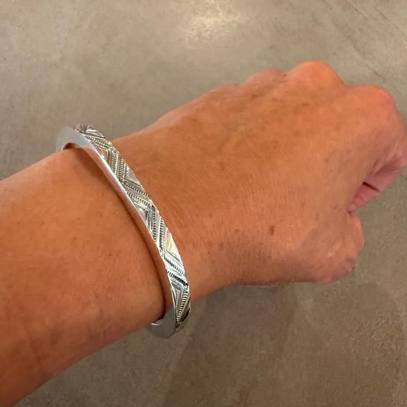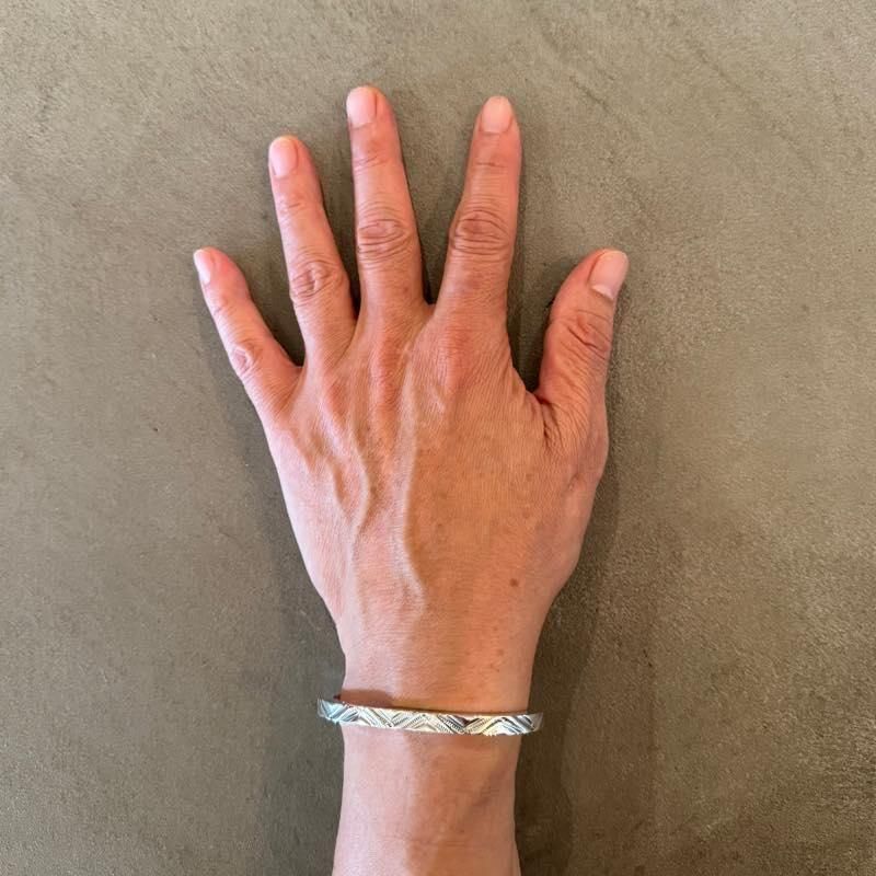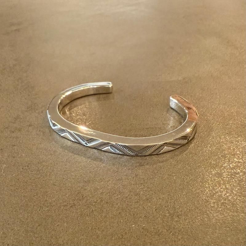四角形のスクエアワイヤーにラグパターンのデザインが配されたSQUARE WIRE BRACELET (RUG PATTERN)です。シンプルですが経年変化に伴って独特な表情を楽しめます。