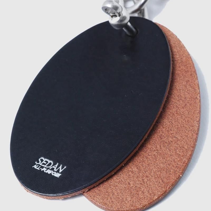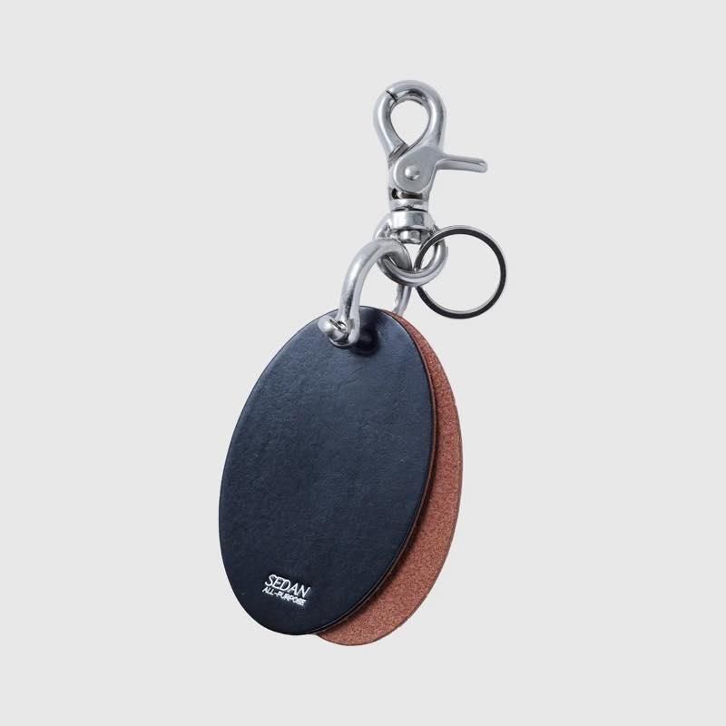 キーホルダーを腰からぶら下げたい勢の期待に応えるべく、大人がぶら下げても恥ずかしくない、本革でどっしりした物を作った。イタリアの牛革でSEDANの下げ札サイズのオーバル型。鍵を3本くらいは付けられるサイズ感。パンツに下げたり、バッグに付けたりとお好きなところでジャラジャラさせてください。NA'VVYに作ってもらったハンドメイド・イン・ジャパン。