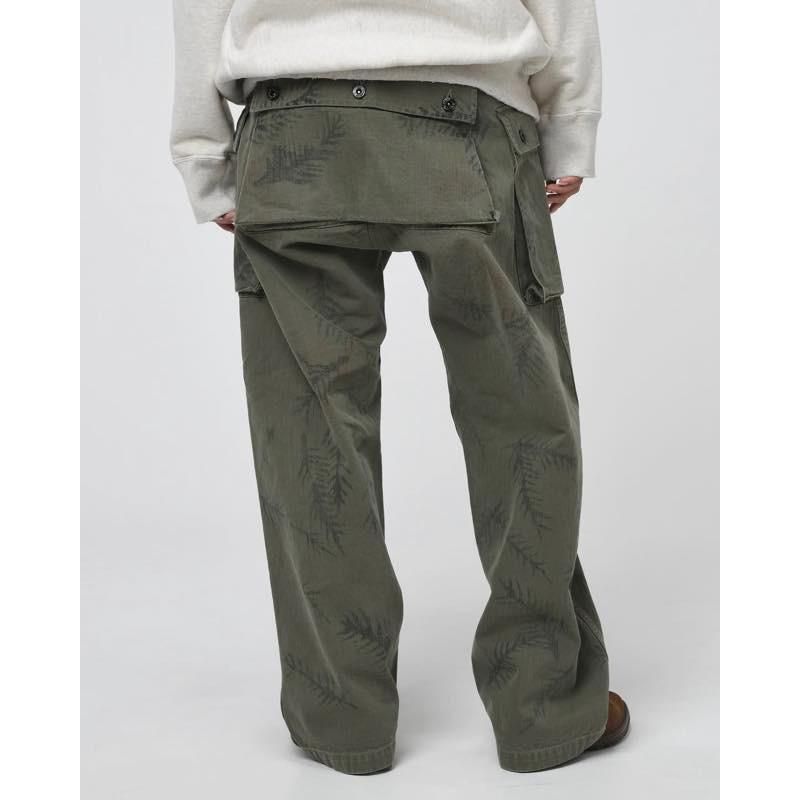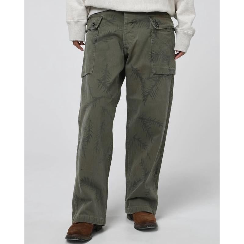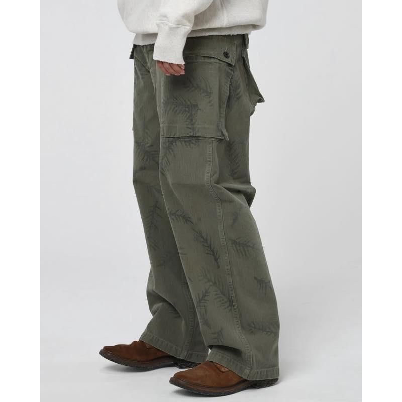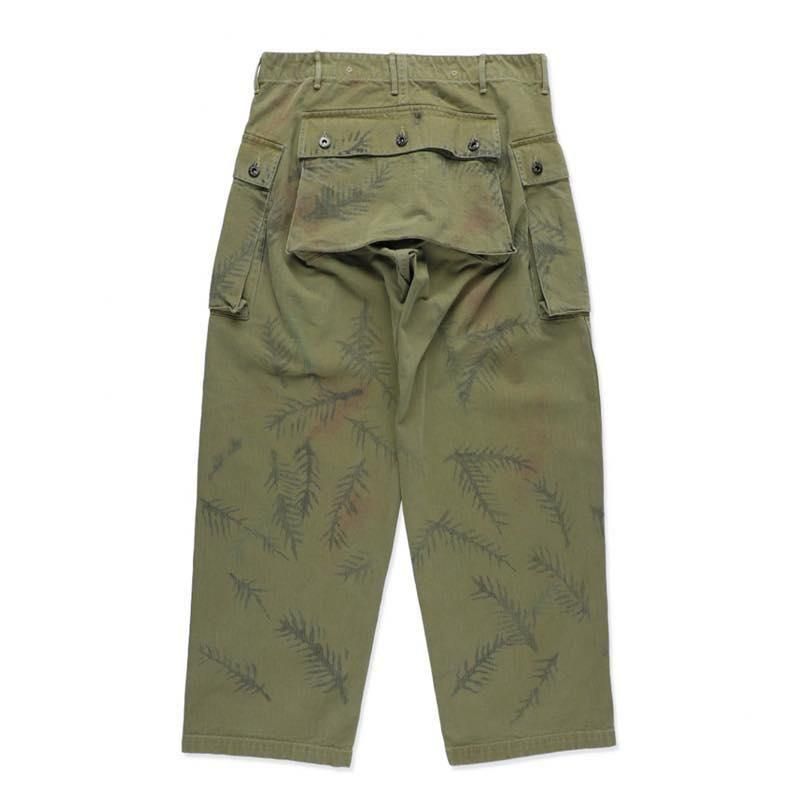 USMCに採用されたP-44 HBT TROUSERSをベースに再構築。米陸軍グリーンベレーがフィールドで用いたとされるハンドペイント迷彩を、塗料の乗りやインクムラ、色抜けまで含めて再現し、さらに着古しのフェード、擦れ、縫製のパッカリングまで追い込んだ加工で“戦地の空気感”を纏わせた一枚。ミリタリーの実用美を核に、現代ストリートで映える新しいカモフラージュを提案。