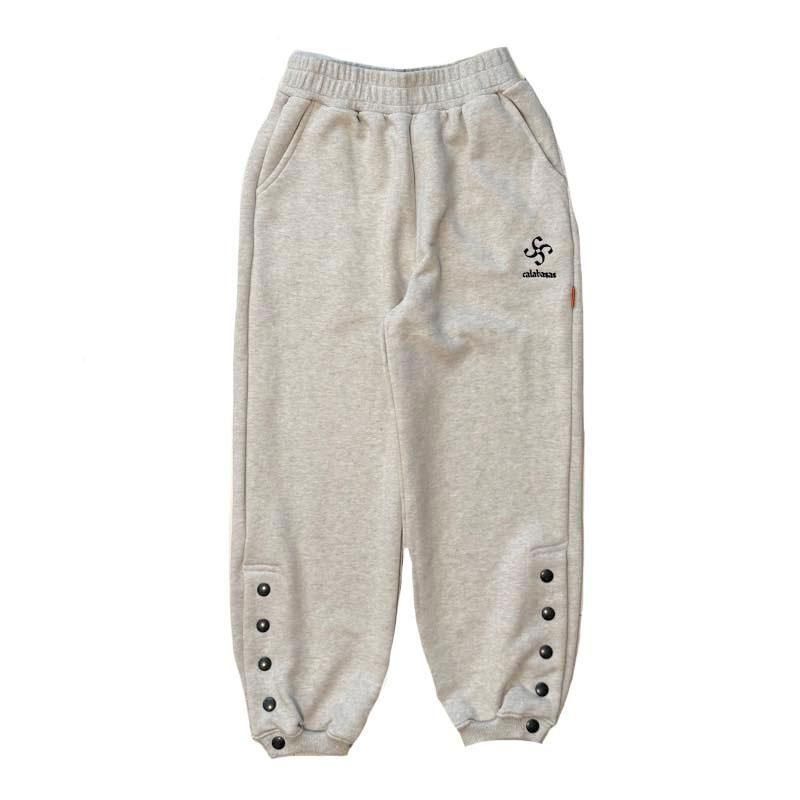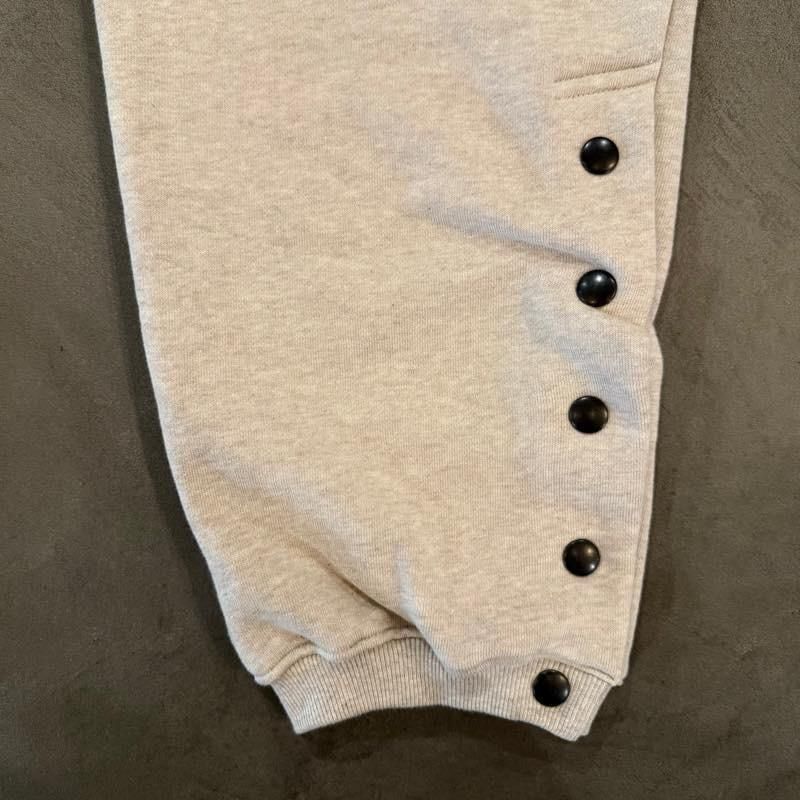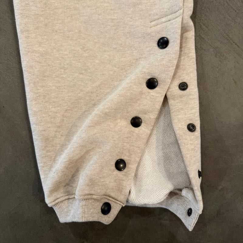 ミドルウェイトのスウェットパンツになります。左腿にブランドロゴが刺繍で配されております。裾はスナップボタン仕様ですのでバッシュを履いたままでの着用が可能です。