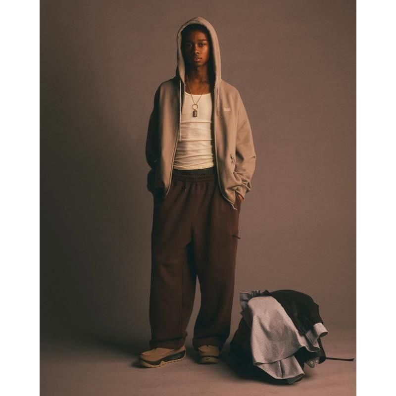 冬はほぼ毎日履いている裏起毛のスウェットパンツ。以前のようなパジャマなイメージが無いのも嬉しい時代の流れの一つ。というかバギーフィットなスウェットパンツは優雅ささえ感じる抜群のシルエットです。あとスウェットパンツに最適な素材はコットンxポリエステルの裏起毛と決まっている。軽くて張りがあってあたたかい。冬のパンツとしては最高でしかないですね。古着のスウェットパンツなどではポケットがなかったり浅かったりで問題になりがちですが、両ヒップポケットと左腿部分がファスナー付きのポケットで安心感が半端ないです。同素材のジップアップフーディーも作ったので、気に入った方はぜひ上下で揃えていただくことをおすすめします。左ヒップポケット口にロゴ刺繍。裾はドローコードで絞って履くことができます。TCなので毛玉はできます。が着込んだ毛玉を愛せよと声を大にして言いたい。