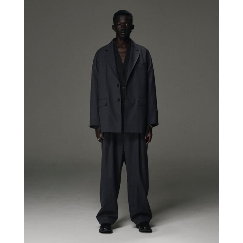 ウール、ポリエステルの混紡糸の高密T/Wサキソニーを使用したパンツになります。クリアな光沢と程よいドレープ性を持つ。表地撥水加工。ハンドウォッシャブル。ドローストリングのバックゴムイージー仕様。前開き有り。2タックのワイドテーパードシルエット。同素材のジャケットとセットアップでの着用が可能です。