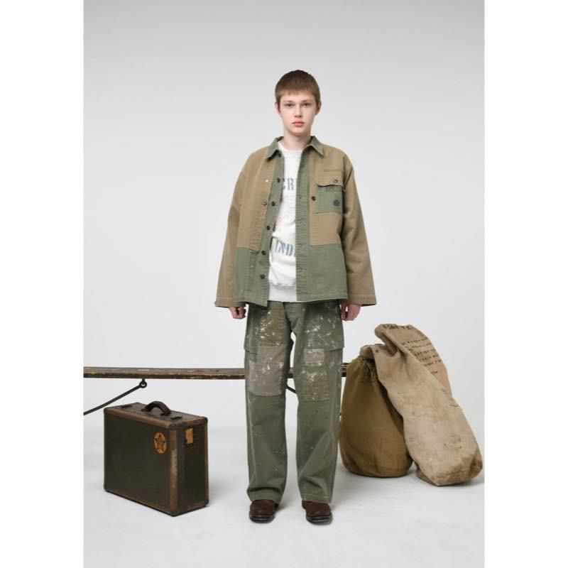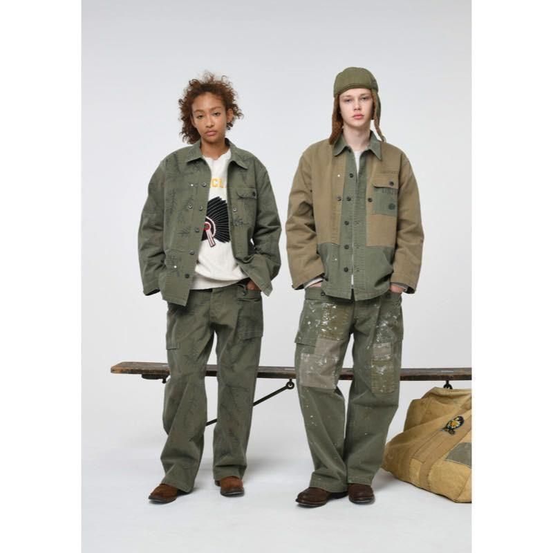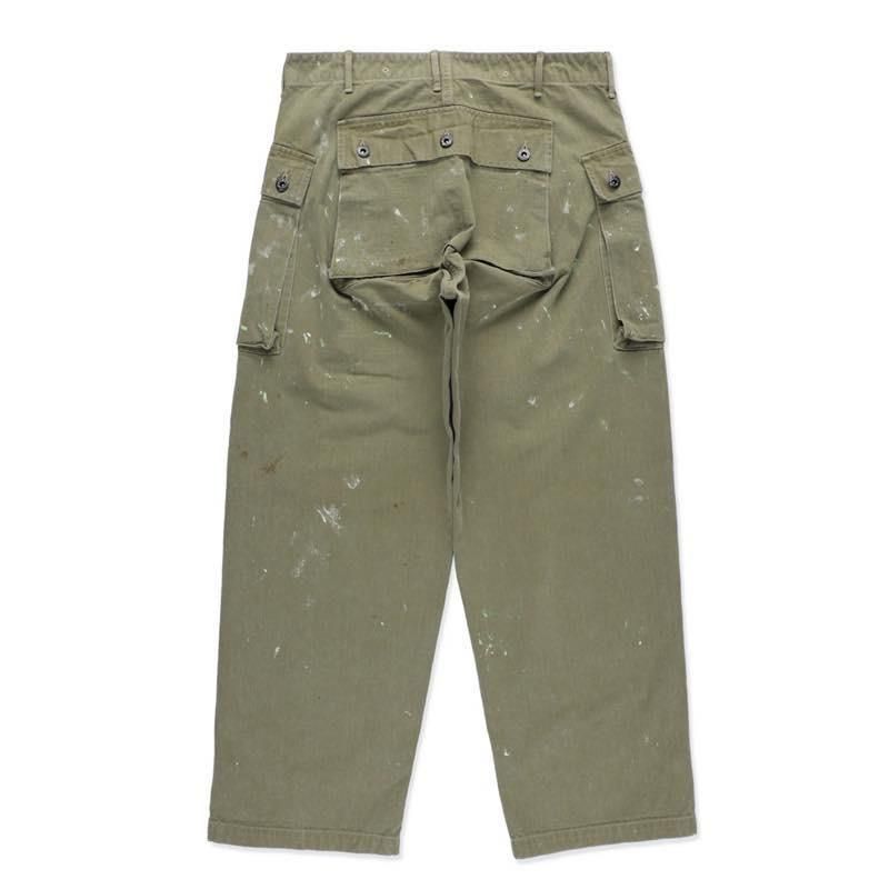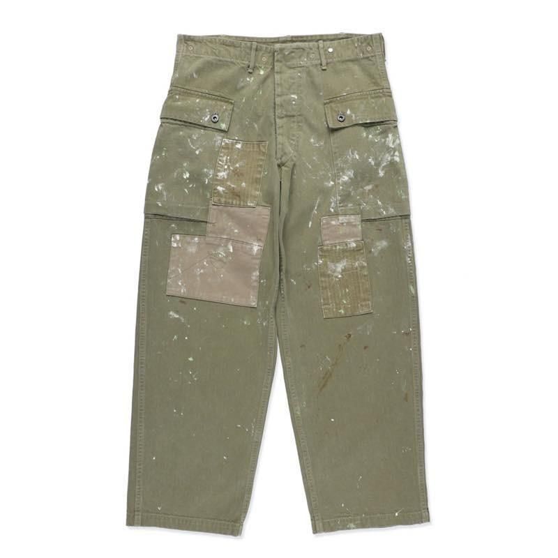 USMC採用のP-44 HBT TROUSERSをベースに再構築。 米陸軍グリーンベレーがフィールドで用いたとされるハンドペイント迷彩を、塗料の乗りやインクムラ、色抜けまで含めて再現し、さらに着古しのフェード、擦れ、縫製のパッカリングまで追い込んだ加工で“戦地の空気感”を纏わせた一枚。ミリタリーの実用美を核に、現代ストリートで映える新しいカモフラージュを提案。