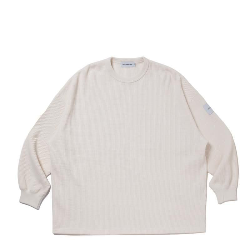 N/C混紡糸を度詰めで編み上げたオリジナルのワッフル生地を使用したワッフルロンTになります。糸目がソリッドに立っており、ドライなタッチが特徴。オーバーサイズシルエット。