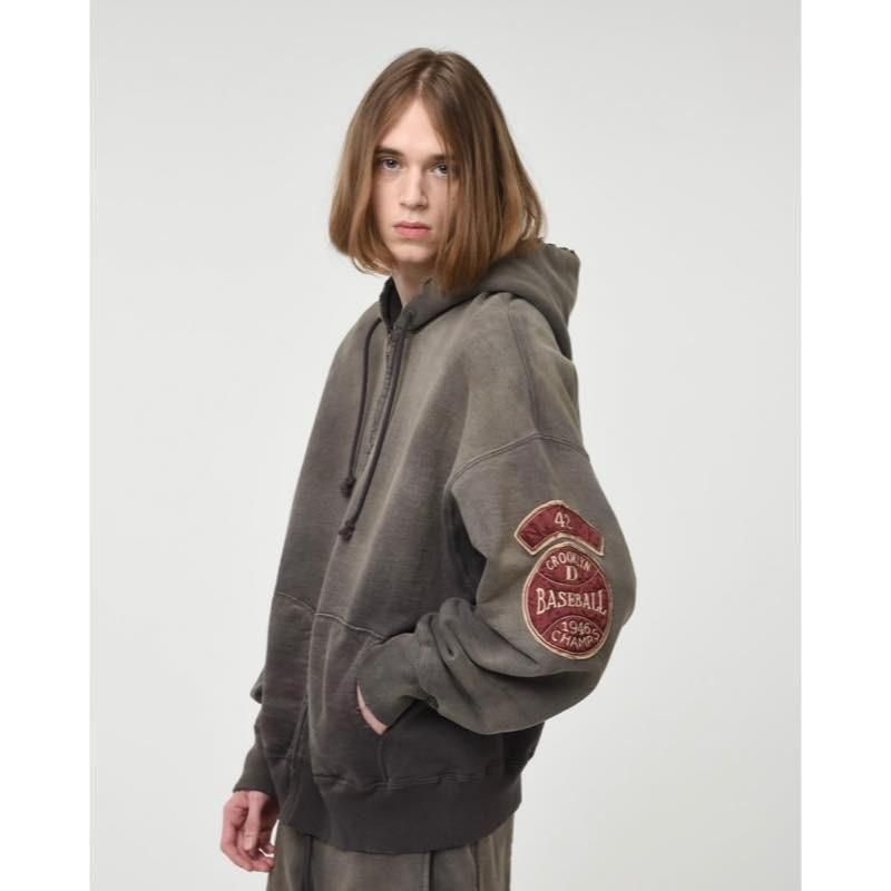 CROOKLYN Dの架空チャンピオンパーカを製作。腕に刻む“42”はジャッキー・ロビンソンへのトリビュート、背には“1946 CHAMPS”パッチを配しチーム史の節目を表現。ビンテージライクなシルエットにブランド定番のセパレートポケットを採用。チームカラーのダークブラウンに映えるフェード、アタリ、擦れを重ねた着古し加工で、当時物さながらの存在感へ。