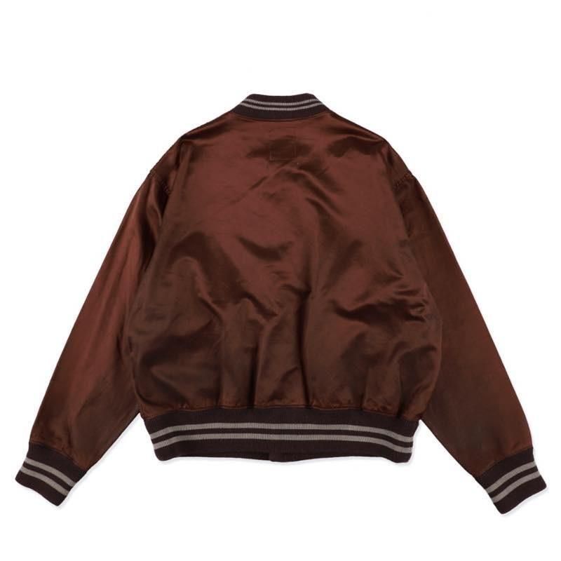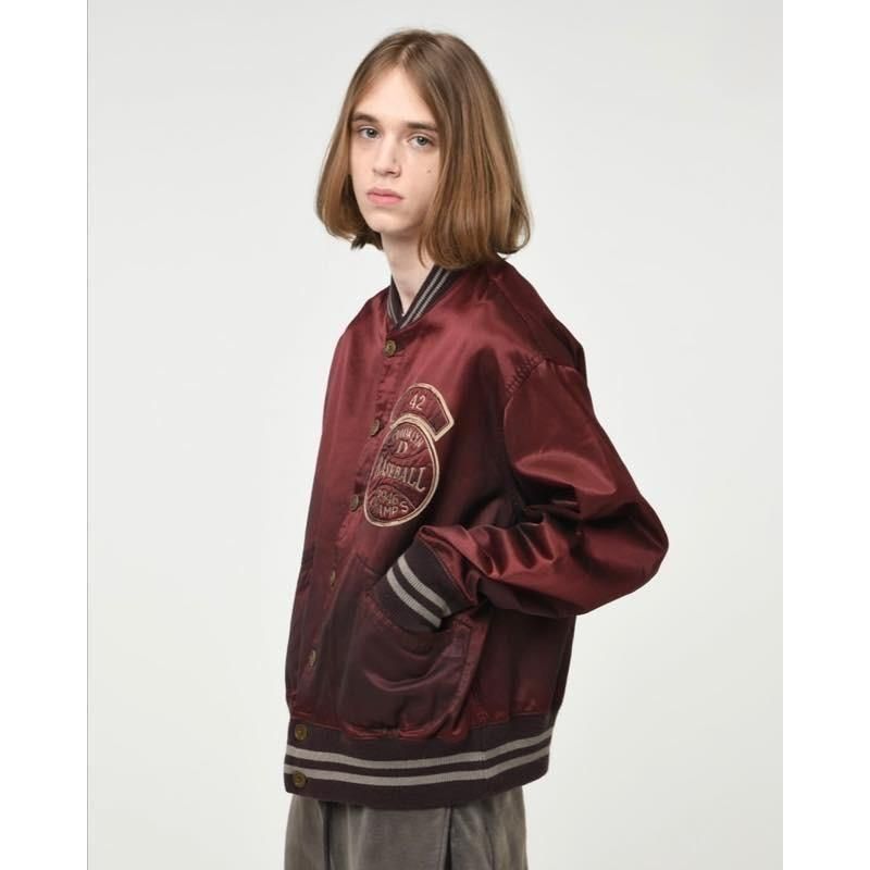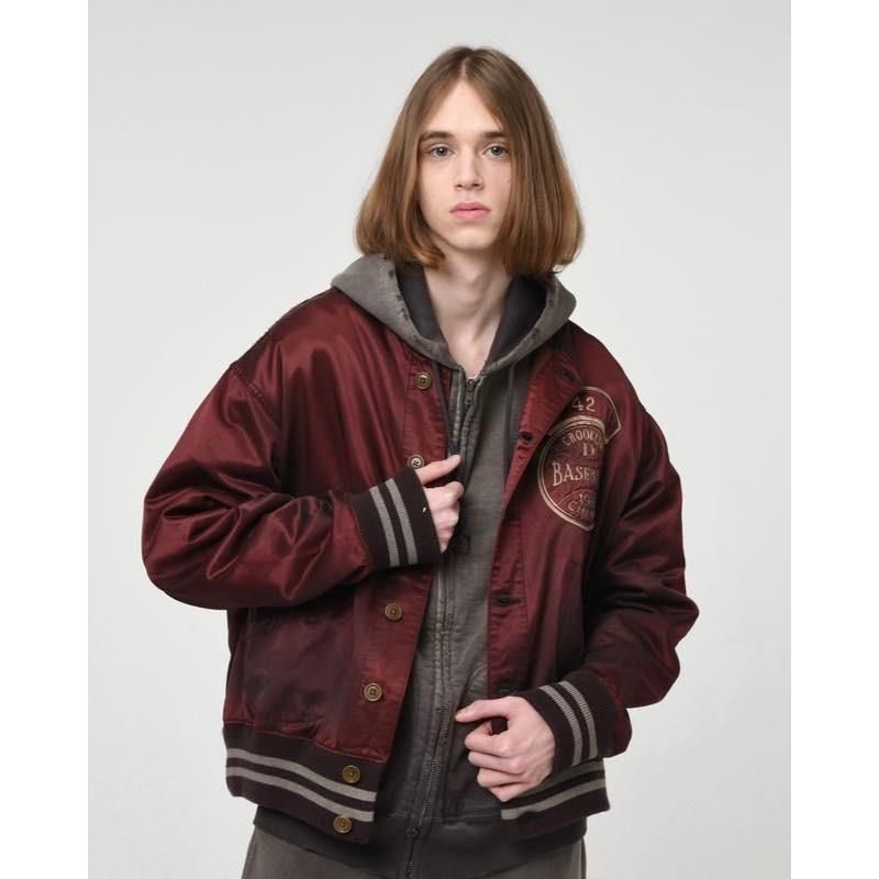 CROOKLYN Dの架空チャンピオンジャケットを再構築。胸に刻む“42”はジャッキー・ロビンソンへのトリビュート、パッチには“1946 CHAMPS”のパッチを配してチーム史の節目を表現。サテンシェルのフェード、パッカリング、汚れ感まで追い込んだエイジングで、記憶の中の一着を現在形へ。