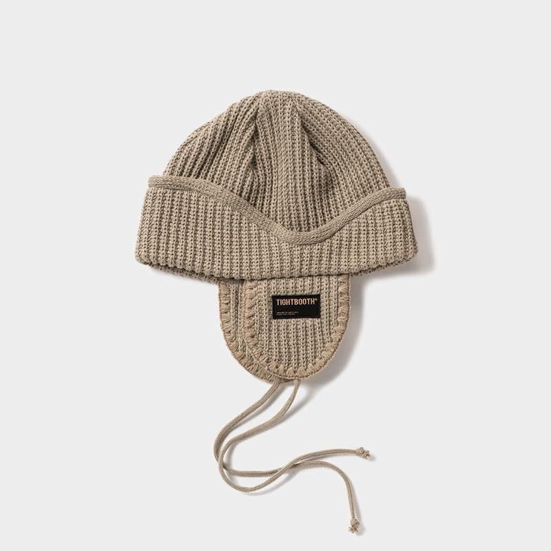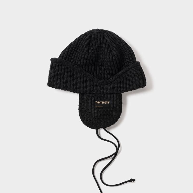 リブ編みで仕上げたフライトビーニー。 フラップにはヌバック風パッチネームと飾り紐付き。