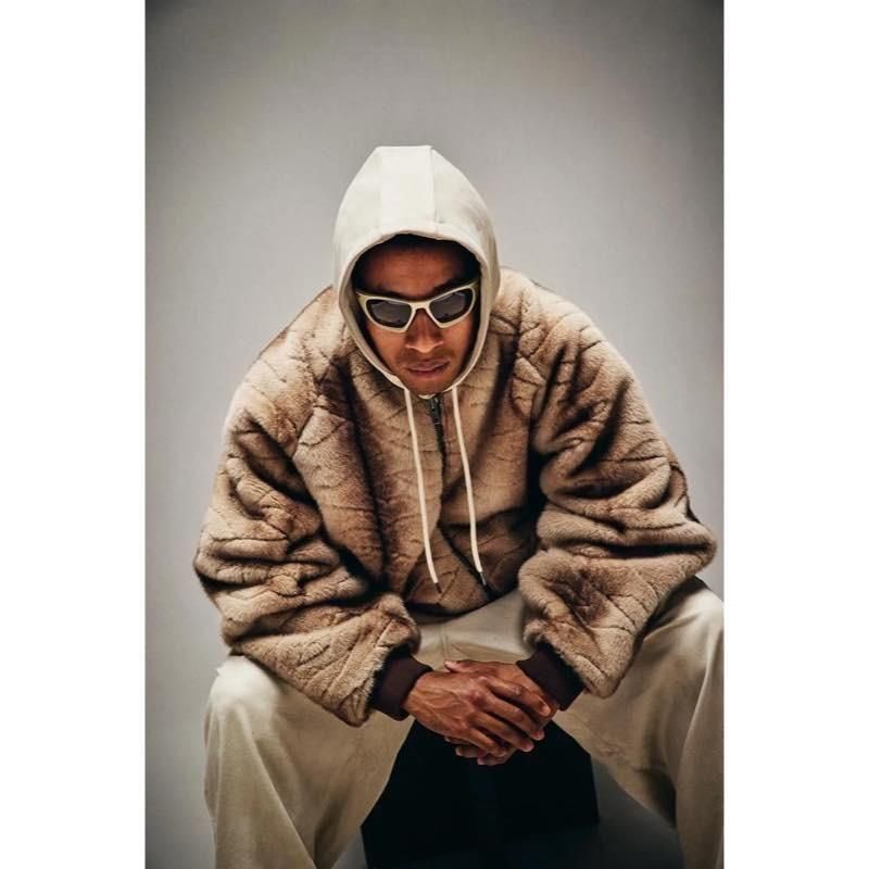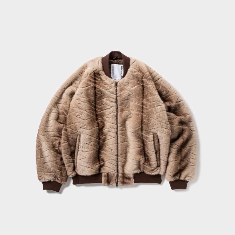 MA-1シルエットを採用した中綿入りのファージャケット。 滑らかな肌触りのフェイクファー生地に、オリジナルのT総柄でキルティング加工。 フロントのオープニングはタブルファスナー仕様。 フロントポケットはファスナー付きで、身頃内側には大きめで便利なメッシュのインナーポケットも搭載。 ラグランスリーブデザインで、袖口と裾はリブ仕様。 左身頃のシームにオレンジのピスネーム付き。 襟元内側にはハンガーループ付き。