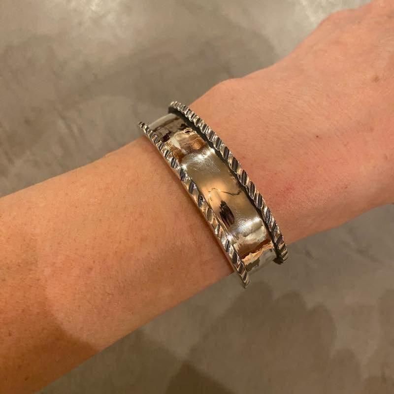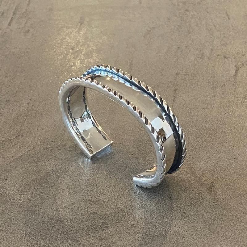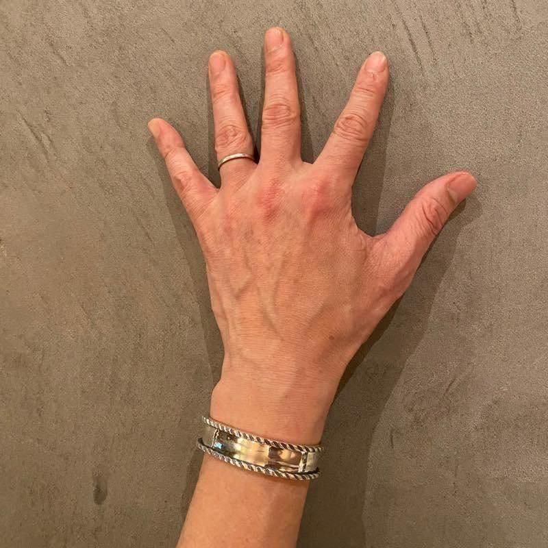 プレーンな表面と高さのあるエッジが特徴のブレスレットになります。シンプルですが経年変化に伴って独特な表情を楽しめます。